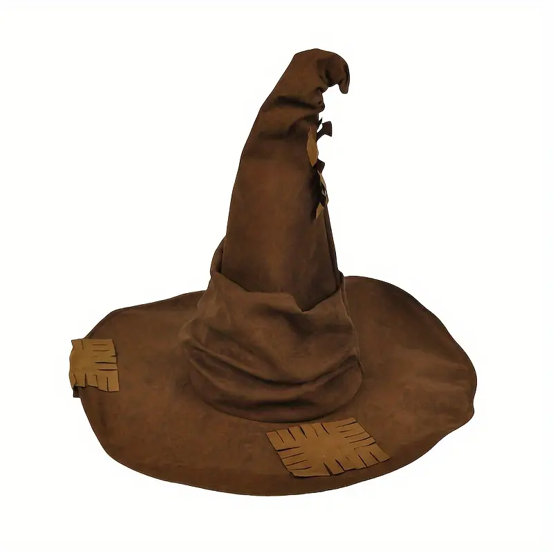 hnědý tvarovatelný čarodějnický klobouk semišového vzhledu.