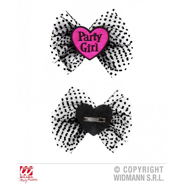 Klip do vlasů se srdíčkem, nápisem "Party Girl" a černou krajkovou mašlí společnosti Widmann vkusně doplní váš sexy kostým při příležitosti staromládenecké párty nebo pořádně divoké dámské jízdy.