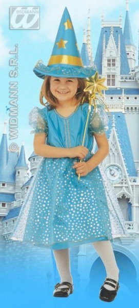 Kostým víla kouzelnice vel.116 pro děti 4-5let.Dětský kostým víla obsahuje světlemodré šaty se zlatými hvězdičkami a klobouk.