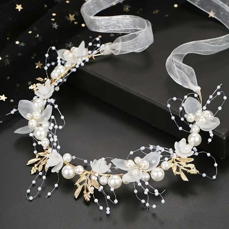 Elegantní čelenka - věneček s květinami zdobený umělými perličkami