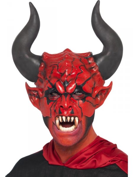 Latexová maska čerta přes celou hlavu k hornímu okraji rtů s obrovskými rohy.