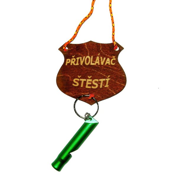 Přivolávač štěstí - Dřevěná tabulka na pověšení s píšťalkou.