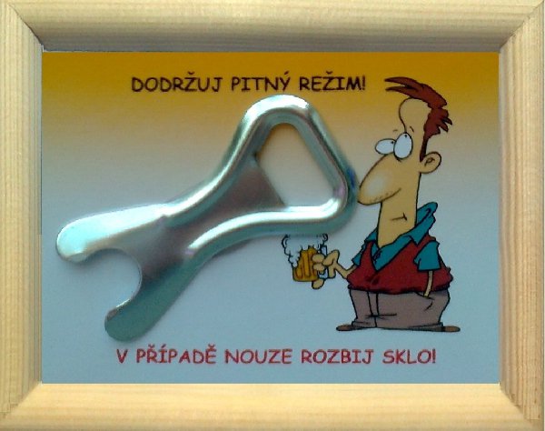 Rozměr 13 x 16 cm, rámeček masiv smrk, pevná sololitová záda, očko na zavěšení. Pod sklem je otvírák.