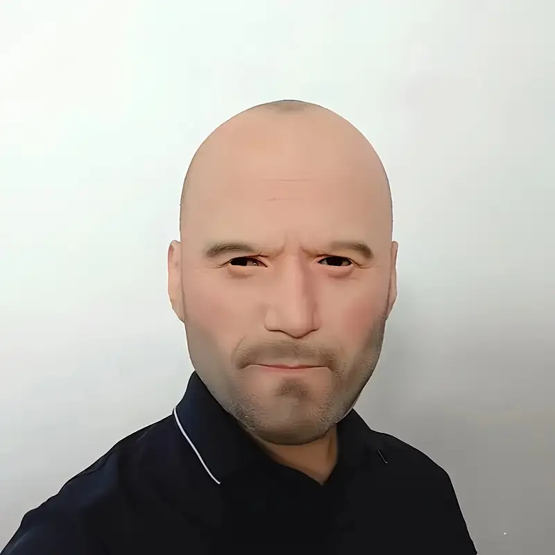 Realistická maska muže na party, cosplay, představující atraktivní mužskou hlavu, ideální pro crossdressing a kostýmové příležitosti.