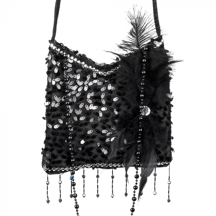 Kabelka Flapper, retro, černá, flitrová, s korálky a peřím. Zapínaní na suchý zip.