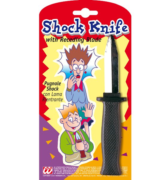 Kanadský žertík – Zasouvací nůž – 19cm - Divadelní rekvizita, při zabodnutí se čepel schová a pomoci pružiny se zase vysune. Využijte této ptákoviny k vystrašení kamarádů. Stejně tak jej můžete využít na Halloween a podobné hororově tematizované akce.Čepel je plastová.